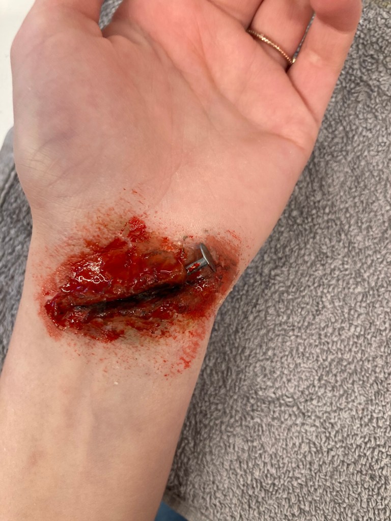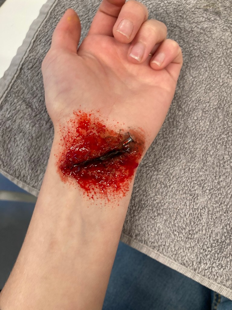 Jeg begyndte med at bruge voksen og sprede den så lavede jeg et langt sår. Jeg tog pulver på lidt gul og blå maling og så sort maling i midten ind i såret og så dækket jeg resten i falsk blod og satte en søm