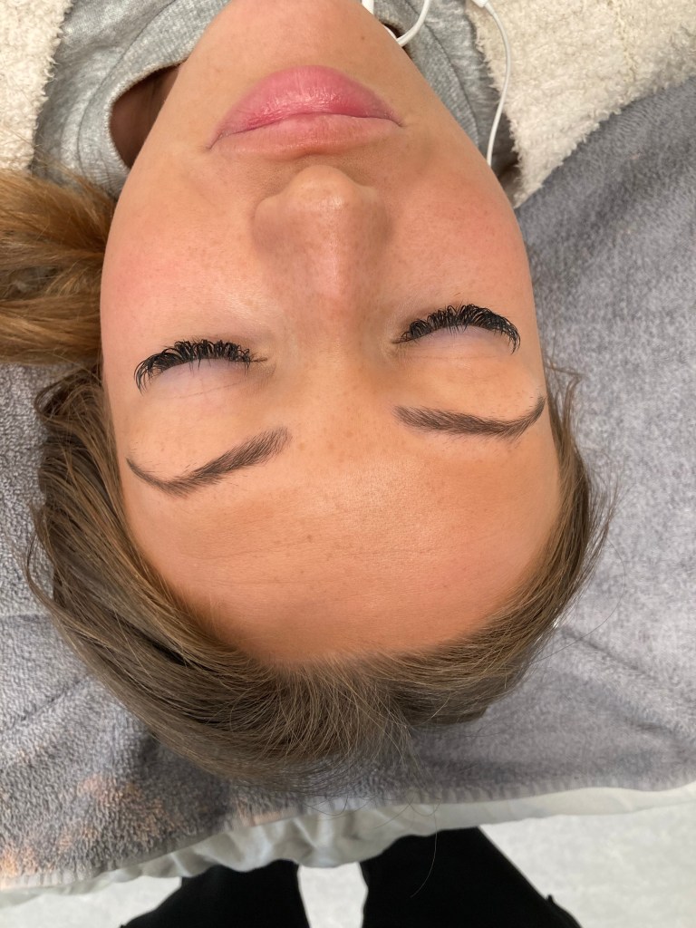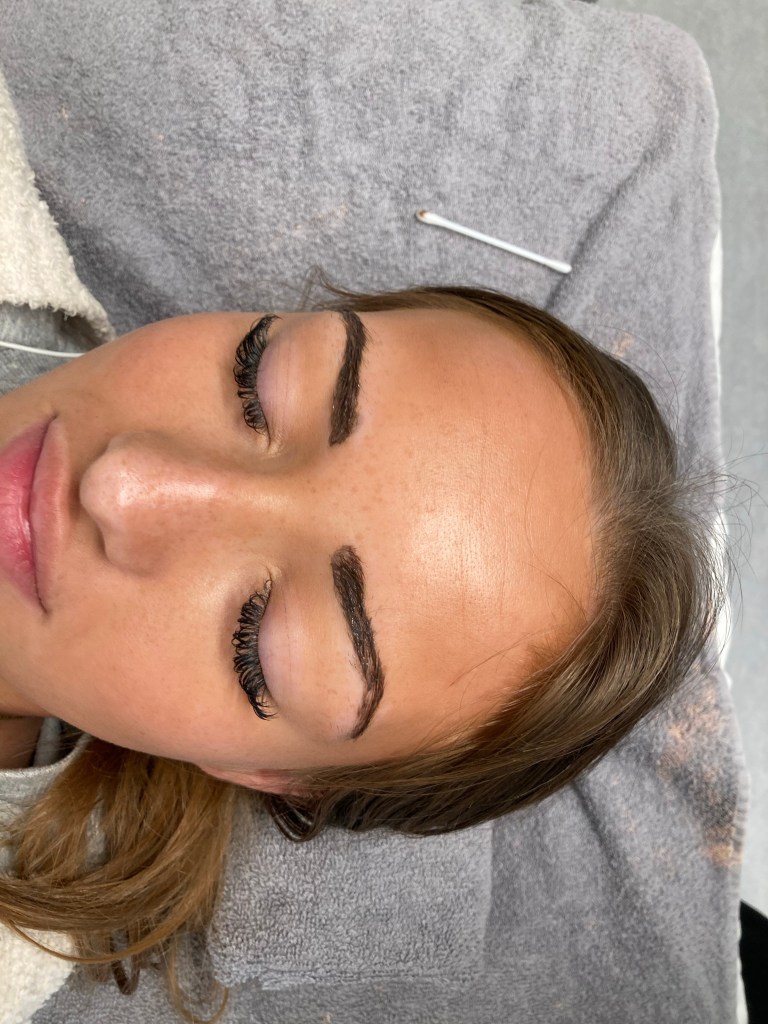 Først blandede jeg den farve som min kunde gerne ville havde og efter på førte jeg det på kundes rene øjenbryn uden make up. Jeg ventede ca 5 min og så fjernede jeg det med først en tør vat runddel og efter en våd.